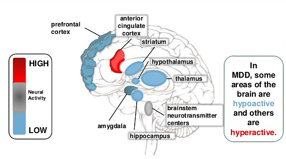 For people with depression, many areas of the brain are underactive: it is difficult to stay awake or present (thalamus), escape negative emotions (amygdala and hypothalamus), and cope with anger or pain of any kind, whether physical, emotional, or mental (anterior cingulate cortex). Since the prefrontal cortex is the main executor in our personality, self-discipline, and concentration, a person with depression may feel helpless. Increasing the excitatory neurotransmitters serotonin (involved in mood) and norepinephrine (crucial for alertness) can help these individuals regain their sense of self.