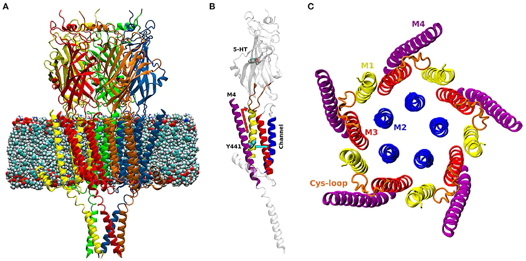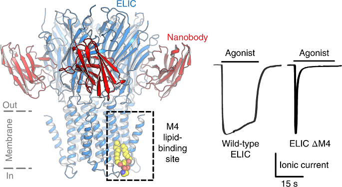 The embedded region, the transmembrane domain (TMD), is made up of four conserved alpha helices (M1-M4). The lipid site in this study is formed by a kink in the outermost transmembrane helix, M4, and a conserved triad of protein residues (Trp-Arg-Pro), which directly interact with surrounding membrane lipids. Mutations to the residues in the lipid binding site produced a dynamic M4 helix and accelerated deactivation of the channel, suggesting that bound lipids influence the agonist response.